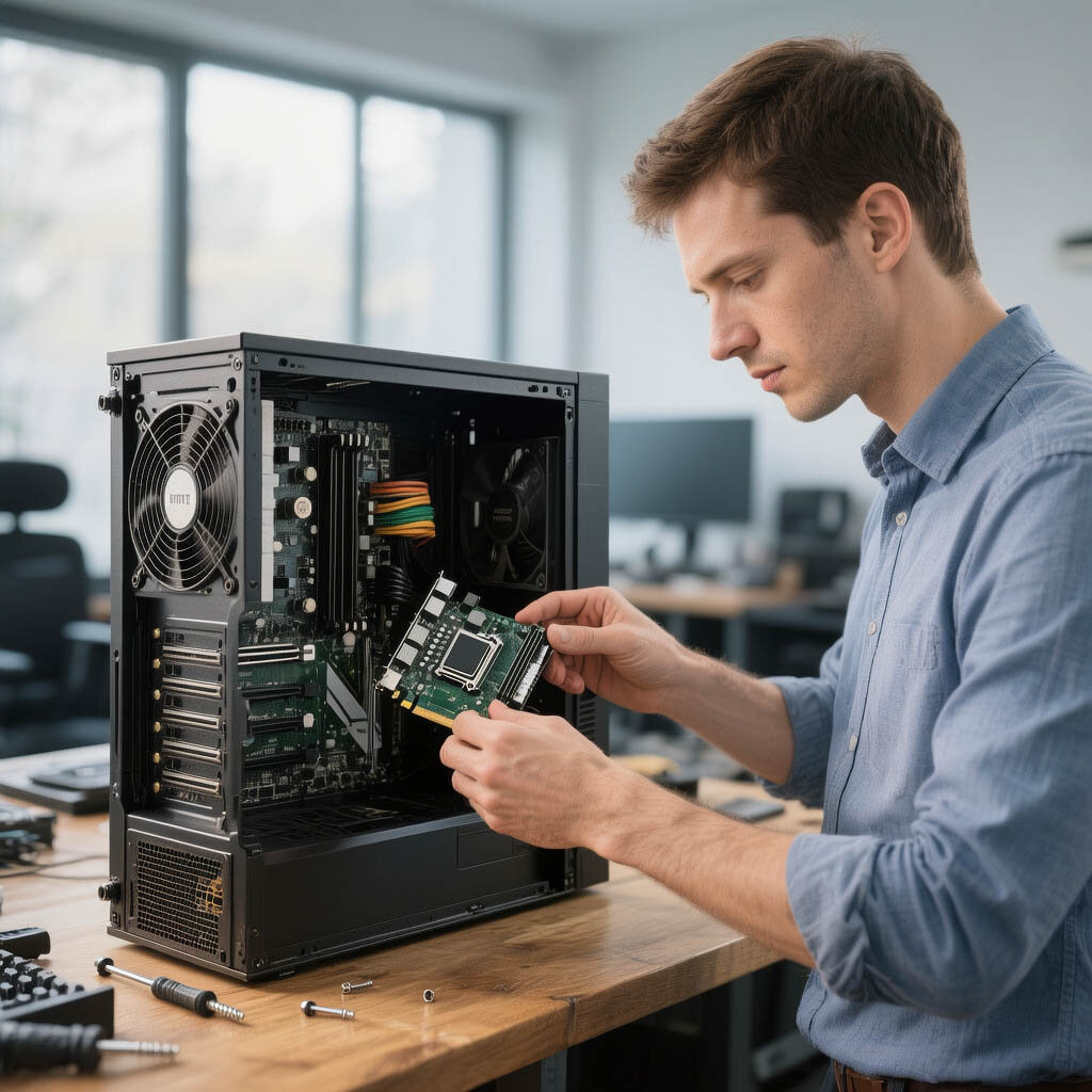Imagínate un banco de trabajo lleno de componentes como procesadores, placas bases, tarjetas gráficas o discos duros. Existe otro tipo de informático que se dedica exclusivamente a ensamblar y textear hardware para crear ordenadores, servidores y portátiles. También los que son especialistas en teléfonos móviles.
